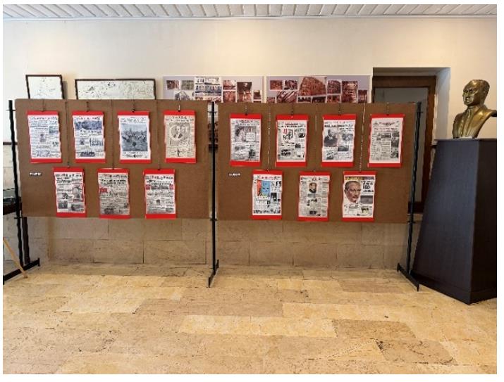 Cumhuriyetimizin 102. yılına özel olarak düzenlenen “102. Yılda 102 Sergi: Cumhuriyet’in Işığında Anadolu’nun Kültürel Mirasına Yolculuk” adlı süreli sergi projesi kapsamında gerçekleştirilen “Gazete Sayfalarında 19 Mayıslar” sergisi; Türkiye’nin bağımsızlık mücadelesinin başlangıcı olmasının yanı sıra, gençliğe armağan edilmesiyle de geleceğe ışık tutan önemli bir simge olan 19 Mayıs’ın anlamına, tarihçesine ve gençlik ile spor alanındaki önemine dikkat çekmiştir. Sergide, arşiv gazeteleri, dergiler ve dijital internet gazetesi sayfalarının fotoğrafları çekilerek, görseller 34 cm x 56 cm boyutlarında, bire bir ölçekte ve renkli olarak fotoblok üzerine 41 adet kopya hâlinde hazırlanmış ve 6 panoda ziyaretçilerin beğenisine sunulmuştur.