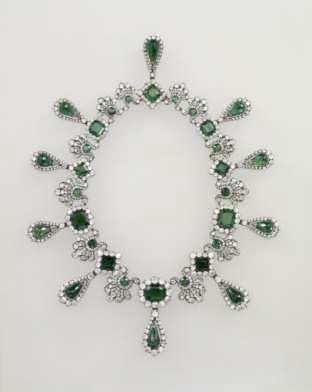 Marie-Louise’in takı takımına ait zümrüt kolye Tür: Mücevher, takı, tılsım; değerli taş ve sert taş Yapım yeri: Paris (Fransa → Île-de-France bölgesi) Yapım tarihi: 1810 Dönem: Birinci İmparatorluk (1804–1814) (Batı → Çağdaş dönem) Malzeme: Altın, elmas, zümrüt Uzunluk: 43 cm Yükseklik: 7 cm | Denon, (Oart), Salon 705 – Apollon Galerisi. Merkezi Vitrinler. Elmaslar Vitrini. İmparatorluk Vitrini. | Çalındı | 1 |