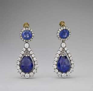 Kraliçe Marie-Amélie ve Kraliçe Hortense’in safir takı takımına ait küpe çifti (OA 11034 ile birlikte bir çiftin parçası) Mücevher, takı, tılsım; değerli taş ve sert taş; küpe Yapım yeri: Paris (Fransa → Île-de-France bölgesi) Yapım tarihi: 1800 – 1835 Dönem: Birinci İmparatorluk (1804–1814) (Batı → Çağdaş dönem); Restorasyon (1814–1830) (Batı → Çağdaş dönem) Malzeme: Safir, elmas, altın Yükseklik: 5,1 cm Genişlik: 2,2 cm | Denon, (Oart), Salon 705 – Apollon Galerisi. Merkezi Vitrinler. Elmaslar Vitrini. İmparatorluk Vitrini. | Çalındı | 2 |