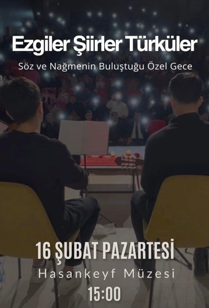 Batman Valiliği İl Kültür ve Turizm Müdürlüğü tarafından 16.02.2026 tarihinde düzenlenen ve beş ilçeyi kapsayan “5 İlçede 5 Konser” etkinlikleri kapsamında, Hasankeyf Müzesi konferans salonunda “Ezgiler, Şiirler, Türküler – Söz ve Nağmenin Buluştuğu Özel Gece” temalı etkinlik gerçekleştirilmiştir. Etkinlikte şiir dinletileri ile geleneksel ve kültürel değer taşıyan müzik eserleri icra edilmiştir.