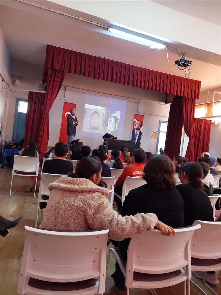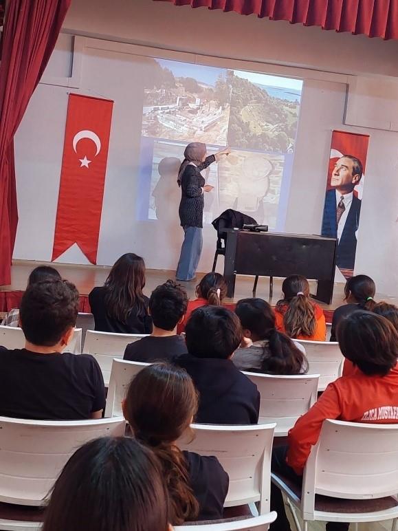Müzelerde gerçekleştirilen eğitim etkinlikleri kapsamında; Çeşme Müzesi tarafından 03.03.2026 tarihinde Çeşme Ilıca Mustafa Bahçeli Ortaokulu 5A/B sınıfları öğrencilerine okulun konferans salonunda (30 kişilik öğrenci grubu) Çeşme Müze Müdürlüğü uzmanları tarafından “Arkeolog ve Arkeoloji Nedir?, Çeşme Kalesi Müzesi’’ konularında bilgilendirme ve görsel destekli sunum yapılarak. Soru-cevap şeklinde etkinlik düzenlenmiştir.